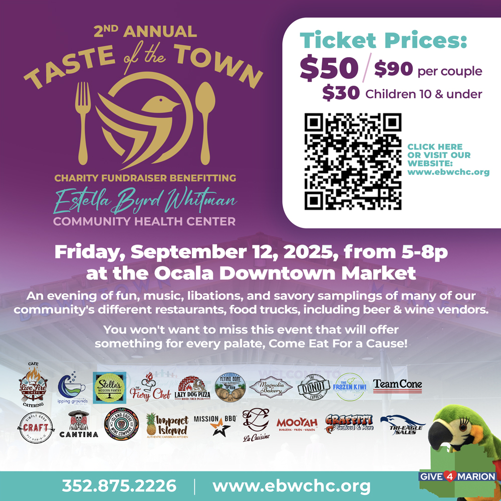 Join us for our 2nd annual charity food beer and wine tasting show, “Taste of the Town” which will be held at the Downtown Market in Ocala, Florida, on Friday, September 12, 2025, from 5-8 PM.